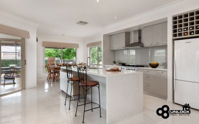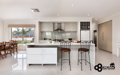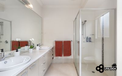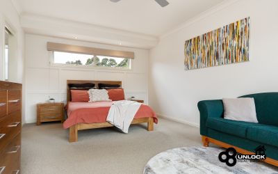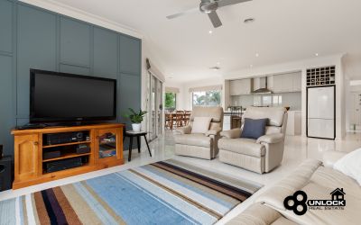 The kitchen boasts a waterfall stone bench top, 900mm oven, dishwasher, and an open dining area. The master bedroom is a parents' retreat with a WIR, an ensuite with a double vanity and a big shower, and access to the breakfast deck. The other two bedrooms have a built in robe and share a large bathroom.