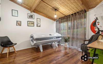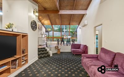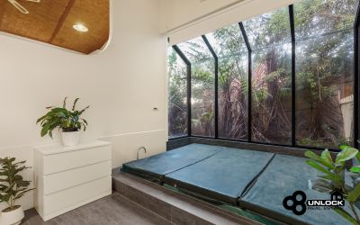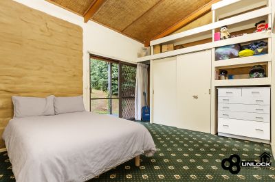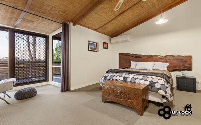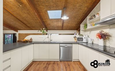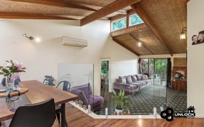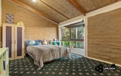 The home’s distinctive mudbrick construction, soaring cathedral ceilings and exposed timber beams create a feeling of calm and authenticity from the moment you step inside. Light streams through large windows that frame leafy views, while the clever split-level layout ensures space and privacy for every member of the family. The main bedroom opens directly to a private spa area and the outdoor entertaining deck, providing the perfect place to unwind at the end of the day. Three further bedrooms are positioned separately and are serviced by two bathrooms, including one with a charming clawfoot bath that complements the home’s rustic appeal.